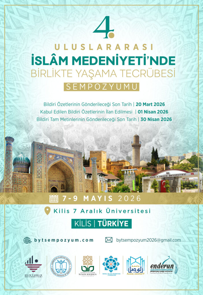 7–9 Mayıs 2026 tarihlerinde Kilis 7 Aralık Üniversitesi ev sahipliğinde gerçekleştirilecek olan sempozyumumuzda; Türkiye, Azerbaycan, Endonezya başta olmak üzere farklı ülkelerden akademisyen ve araştırmacıların katılımıyla, İslâm medeniyetinde adalet, barış, çoğulculuk ve birlikte yaşama anlayışı çok disiplinli bir perspektifle ele alınacaktır.